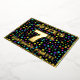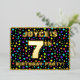 The front of this upbeat seventh birthday party/celebration foil invitation card design features a customizable name, a large number “7th”, the message “BIRTHDAY PARTY!”, and a border. The background of the front has a joyful, multicolored starfield pattern. The back features personalized details about the event, such as the date, time, location/venue, and any other relevant information. Customized invitations like these might be a fun way to invite attendees to a birthday gathering/party being held to celebrate somebody’s 7th birthday. [~Z0000600]