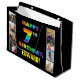 This eye-catching and fun birthday-themed gift bag design features the message “HAPPY 7TH BIRTHDAY,“ with the text having a vibrant multicolored rainbow spectrum inspired gradient pattern, along with a customisable recipient name. To the left and the right of the rainbow-patterned message on the front are some photos that can be personalised, perhaps with photos of the recipient, the recipient’s family and friends, and/or the sender(s) of the gift. A giftbag like this might be used when wrapping presents being given to somebody in celebration of their seventh birthday. (Photography © Storytree Studios, Stanford, CA.) [~Z0000668]
