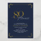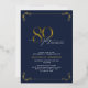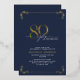 This beautiful invitation features hand lettered calligraphy artfully presenting 'eighty' in luxurious hand lettering against a blue background, adorned with delicate swirls in the corners top and bottom in real gold foil, along with the name and the number 80. This image will have all your guests excitedly anticipating your fabulous eightieth festivities!