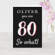80 so what Funny saying Typography Black 80th Birthday card. Funny and inspirational quote 80 so what for a man or a woman celebrating the 80th birthday. Personalize this card with your name, age and your text on the front, inside and on the backside of the card.