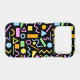 1980s style pattern in colorful shapes of green, yellow, blue and yellow on a black background.