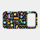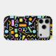1980s style pattern in colorful shapes of green, yellow, blue and yellow on a black background.