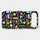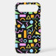 1980s style pattern in colorful shapes of green, yellow, blue and yellow on a black background.