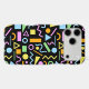 1980s style pattern in colorful shapes of green, yellow, blue and yellow on a black background.