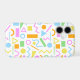 1980s style pattern in colorful shapes of green, yellow, blue and yellow on a white background.