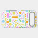 1980s style pattern in colorful shapes of green, yellow, blue and yellow on a white background.
