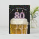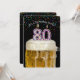 Number 80 candles in mug of beer with colourful confetti on black for 80th birthday party invite.
