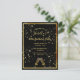 A trendy, modern 80th birthday party invitation card for a woman. A classic black background, with faux gold frame and champagne flutes, glass and bubbles, golden coloured letters. Templates for your party information. Back: white background.