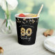 Modern and festive black and gold personalised 80th birthday party paper cups featuring the title 80 YEARS IN THE MAKING, script typography, faux metallic gold balloon numbers, gold streamers and confetti and white lights with your custom text in your choice of background colour (shown in black). ASSISTANCE: For help with design modification or personalisation, colour change, transferring the design to another product or if you would like coordinating items, contact the designer BEFORE ordering via Zazzle Chat or email makeitaboutyoustore@gmail.com.