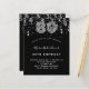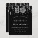A modern, stylish and glamourous invitation for a 80th birthday party. A black background, decorated with silver confetti. The name is written with a modern hand lettered style script. Personalise and add your party details. Number 80 is written with a trendy balloon style font, leopard pattern.