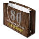 This American Old West look and country inspired birthday themed gift bag design features a large rustic inspired number "80", the message "Happy 80th Birthday,", a customisable name, and a faux/imitation wood grain inspired style pattern background. A customised birthday gift bag like this might be fun to use when wrapping presents being given in celebration somebody’s eightieth birthday. [~Z0000470]