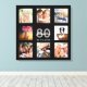 A unique 80th birthday gift or keepsake, celebrating her life with a collage of 8 of your photos. Add images of her family, friends, pets, hobbies or dream travel destination. Personalise and add a name, age 80 and a date. Grey and white coloured letters. A chic black background. This canvas is also available in our store with white or rose gold coloured background.