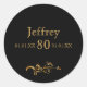 A sticker for an elegant black and gold themed 80th birthday party. Templates for a name, age, date of birth and date of the anniversary. Golden coloured letters, classic block style script. Black background colour. With classic swirl decor. You can change the background colour to match your theme. Click customise and then "select a background colour" on your right.