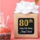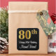 This stylish, elegant, and sophisticated birthday themed sticker design features a large ordinal number “80th” having a faux/imitation gold-inspired look, in addition to the birthday greeting message “Happy 80th Birthday,” and a custom name in a script-style font. It also has a black-coloured background. Stylish stickers like this might be used when wrapping gifts being given to somebody in celebration of their 80th birthday, or perhaps may be given out to the guests at a birthday party. [~Z0000517]