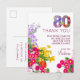 Celebrate a milestone birthday with this beautifully designed 80th birthday thank you card, featuring vibrant floral accents and an elegant "80" graphic. This card offers a heartfelt way to express gratitude to friends and family for their presence and generous gifts on this special occasion. The floral border adds charm, while the customisable text ensures a personal touch. Ideal for those who want a memorable and elegant way to say "thank you" after a 80th birthday celebration. Enjoy!