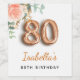 For an elegant and feminine 80th birthday birthday party. A chic white background. Decorated with a rose gold and blush pink watercolored rose flower, floral, green eucalyptus leaves, sprigs, greenery and faux gold sprigs. Personalise and a name. Black and golden letters. The name is written with a modern hand lettered style script. Number 80 is written with a golden balloon style font.
