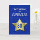 80th birthday card for a superstar. A big gold star carrying the age floats in the heavens. In the background stars twinkle. A great birthday card for someone very special.