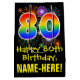 This fun, exciting, and colourful birthday themed giftbag design features a large number "80" with a rainbow spectrum gradient inspired pattern, along with the message "Happy 80th Birthday,", and a custom recipient name. It also features a colourful background pattern inspired by bursting celebratory fireworks. A gift bag like this might be used when wrapping gifts being given to somebody in celebration of their 80th birthday. [~Z0000509]