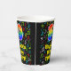 This cheerful and colourful music-themed birthday paper cup design features a large number “80” with a rainbow spectrum gradient inspired pattern, along with the message “Happy 80th Birthday,”, and a personalised name. The background features a vibrant and colourful pattern having music notes and symbols of various sizes and colours. Vibrant, colourful paper cups like this might be fun to have at a birthday party being held to honour somebody’s eightieth birthday. [~Z0000541]