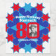 Blue and red 80th birthday add your own photo wine labels. Add your own eightieths birthday photo to the 0 of 80 and customise with the birthday message / name of your choice. Currently reads Happy Birthday Kenneth 80 a classic vintage. A great way to customise your alcoholic birthday gifts. Unique design by Sarah Trett. www.sarahtrett.com