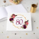 A Guest Book for a 80th birthday party. A chic white background with a faux gold geometric frame. Decorated with dark purple and burgundy flowers, roses and boho style feathers. Templates for a name, age 80 and a date. Date of birth or the date of the party. The name is written with a hand lettered style script, pink coloured letters, age in purple and the date with black numbers. Text on the spine.