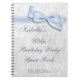 Elegant Eightieth Birthday Party guest book women. 80th Birthday Party! Beautiful white damask pattern background with a pretty, stylish romantic blue bow and ribbon image. These glamourous, classy guest books are perfect for women and are decorated / printed on the front side only. Women will love this chic modern birthday party guest book. All text is fully customisable to meet your requirements. PLEASE NOTE: All products on Zazzle have flat printed images. Bow and ribbon images purchased from digital-designs-by-elena. If you need any assistance customising your product please contact me through my store and I will be happy to help.