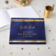 A 80th Birthday Party Guest Book for him, boy, guy in dark blue, navy blue background. The blue colour is uneven. With a faux gold frame and golden confetti sprinkle, golden coloured letters.