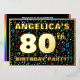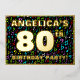 The front of this joyful eightieth birthday celebration/party foil invitation card design features a personalised name, a large number “80th”, the message “BIRTHDAY PARTY!”, and a border. The background of the front features an upbeat, multicolored pattern of musical symbols. The back features personalised details about the event, such as the date, time, venue, and any other information that may be important. Customisable invitations like these might be a fun way to invite attendees to a birthday party/gathering being held in celebration of somebody’s 80th birthday. These might be extra special if that person is a composer, a songwriter, a musician, a singer, or a lover of music. [~Z0000601]
