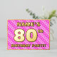 The front of this upbeat eightieth birthday party/celebration foil invitation card design features a customisable name, a large number “80th”, the message “BIRTHDAY PARTY!”, and a border. The background of the front features a fun pattern with light pink and dark pink stripes and heart shapes. The back features personalised details about the event, such as the date, time, location, and any other information that may be important. Editable invitations like these might be a fun way to invite attendees to a birthday party being held in celebration of somebody’s 80th birthday. [~Z0000603]