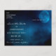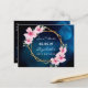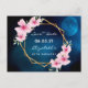 On front: Trendy tropical style. With a faux gold geometric frame decorated with pink hibiscus, flowers tropical florals with some greenery. A dark blue tropical night sky with a full moon as background Templates for a name and date. White letters. The name and the text: Save the Date are written with a modern hand lettered style script.