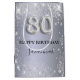 Elegant, classic, glamourous 80th birthday party. A silver background. Decorated with glitter dust. Personalise and add a name. With the text: Happy Birthday. The name is written with a modern hand lettered style script. Number 80 is written with a balloon style font.