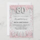 A modern, stylish and glamourous invitation for a 80th birthday party. A faux silver looking background, decorated with pink and faux silver glitter dust. Personalise and add your name nad party details. Number 80 is written with a balloon style font, script.