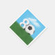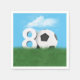 A black and white soccer ball in green grass, blue sky, and white fluffy clouds for an 80th birthday party.