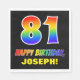 This cheerful, fun, and colourful birthday-themed paper napkin design features a large number "81" and the message "HAPPY BIRTHDAY,", both having a rainbow spectrum gradient inspired pattern colouring, along with a bold yellow custom recipient name. The background is coloured black. Birthday themed paper napkins like this might be used at a party celebrating somebody’s 81st birthday. [~Z0000476]