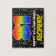 This bold and vibrant birthday themed jigsaw puzzle design features a large number “81” with a multicolored rainbow spectrum inspired gradient pattern, along with the message “HAPPY 81st BIRTHDAY,”, and a personalised recipient name. The background features an exciting, colourful pattern featuring star shapes of various sizes. A colourful, customisable birthday puzzle like this might be a fun way to deliver birthday greetings to somebody who is celebrating their eighty-first birthday. [~Z0000607]