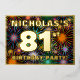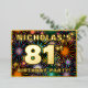 The front of this bold eighty-first birthday celebration foil invitation card design features a customisable name, a large number “81st”, the message “BIRTHDAY PARTY!”, and a border. The background of the front has a fun, colourful pattern inspired by bursting celebratory fireworks. The back features personalised details about the event, such as the date, time, location, and any other important information. Editable invitations like these might be a fun way to invite guests/attendees to a birthday gathering being held to celebrate somebody’s 81st birthday. [~Z0000602]