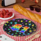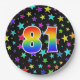 This cheerful, fun, and colourful paper plate design features a large number "81" having a rainbow spectrum gradient inspired pattern colouring. The background features a colourful pattern of star shapes. Fun paper plates like this might be used at somebody’s eighty first birthday celebration, or a couple’s 81st anniversary party, or some other eighty first event. [~Z0000493]
