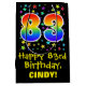 This vibrant, exciting, and colourful birthday giftbag design features a large number "83" with a rainbow spectrum gradient style pattern, along with the message "Happy 83rd Birthday,", and an editable recipient name. It also has a colourful background pattern featuring star shapes of various sizes. A birthday themed gift bag like this might be a fun way to wrap a gift or present being given to somebody who is celebrating their eighty third birthday. [~Z0000510]