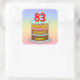 This colourful and fun birthday-themed square sticker design features a cartoon-style depiction of a three-tier birthday cake having number-shaped candles on top showing the age “83“, along with the message “HAPPY 83RD BIRTHDAY,”, and a custom recipient name. The background features a multicolored pastel rainbow spectrum inspired gradient pattern. Cheerful birthday themed stickers like these might be given out or used at a birthday party celebrating somebody’s eighty third birthday, or perhaps used when preparing gifts or invitations for such an event. [~Z0000624]