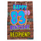 The front of this fun birthday-themed gift bag design features the message “HAPPY 83RD BIRTHDAY,” having a vibrant, colourful, graffiti-inspired look, in addition to a personalised recipient name. The background features a brick wall inspired pattern. A birthday themed giftbag like this might be used when giving a gift or present in celebration of somebody’s 83rd birthday. [~Z0000536]