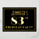 The front of this 1920s/1930s style inspired eighty-third birthday celebration foil invitation features a personalised name, a large art deco look inspired number “83rd”, the message “BIRTHDAY PARTY”, and a border pattern consisting of lines. The background of the front is coloured black by default, but it can be customised to a different colour if desired. The back features personalised details about the event, such as the date, time, venue, and any other information that may be important. Luxurious, elegant, personalised invitations like these might be used to invite guests to a birthday gathering/party being held to celebrate somebody’s 83rd birthday. [~Z0000591]