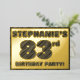 The front of this bold eighty-third birthday celebration foil invitation card features a custom name, a large number “83rd”, the message “BIRTHDAY PARTY!”, and a border, all featuring a rustic, yet elegant, faux wood grain appearance inspired pattern. The back features personalised details about the event, such as the date, time, place/venue, and any other important information. Personalised invitations like these might be used to invite attendees to a birthday gathering/party being held in celebration of somebody’s 83rd birthday. [~Z0000595]