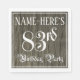 This ornate and fancy birthday party themed paper napkin design features a custom name and the message “83rd Birthday Party”. The large number “83rd” and the words “Birthday Party” are in elaborate script-style text. The background has a faux/imitation woodgrain-inspired pattern. Luxurious, elaborate paper napkins like this might be useful to have at a birthday party/celebration being held in celebration of somebody’s 83rd birthday. [~Z0000564]