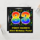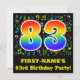 The front of this fun, vibrant, and exciting birthday party invitation design features a large number "83" with a rainbow spectrum gradient inspired pattern, along with a custom name and the message "83rd Birthday Party!" Part of the background features a fun and colourful music notes and symbols pattern. The back features customisable details/information pertaining to the event that the potential guests are being invited to. Happy, customised birthday party invitation cards like this might be sent to potential guests of a celebratory gathering being held to honour a song composer’s, a singer’s, a musician’s, or somebody else’s 83rd birthday. [~Z0000427]