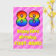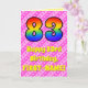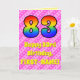 The front of this fun and upbeat 83rd birthday-themed greeting card design features a large number "83" having a colourful pattern inspired by the appearance of a rainbow spectrum. It also features the message "Happy 83rd Birthday,", followed by a personalised recipient name. The background of the front features a cheerful pattern of light pink and dark pink stripes containing loving pink heart shapes. The inside features a custom birthday greeting message, or could perhaps be cleared and left blank if a message is to be written by hand instead. A custom birthday card like this might be a fun way to send birthday wishes to somebody who is celebrating their eighty third birthday. [~Z0000416]