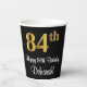 This stylish, luxurious, and sophisticated birthday-themed paper cup design features a large ordinal number “84th” having a faux/imitation gold-inspired appearance, along with the birthday greeting message “Happy 84th Birthday,” and an editable name in a script-style font. It also has a black-coloured background. Elegant birthday themed paper cups like this might be used at a party celebrating somebody’s eighty fourth birthday. [~Z0000538]