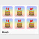 This colourful and fun birthday-themed square sticker design features a cartoon-style depiction of a three-tier birthday cake having number-shaped candles on top showing the age “84“, along with the message “HAPPY 84TH BIRTHDAY,”, and a customisable recipient name. The background features a multicolored pastel rainbow spectrum inspired gradient pattern. Joyful stickers like these might be used or given out at a party held for somebody in celebration of their 84th birthday, or perhaps used when preparing invitations or wrapping gifts for such an event. [~Z0000624]
