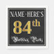This opulent and luxurious birthday paper napkin design features a custom name and the message “84th Birthday Party”. The large number “84th” has an imitation/faux gold-inspired coloring pattern, and the words “Birthday Party” are in fancy script-style text. The background is colored black by default (although it can be customized). Ornate, fancy paper napkins like this might be used at a birthday celebration/party being held to honor somebody’s eighty fourth birthday. [~Z0000565]