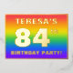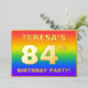 The front of this vibrant eighty-fourth birthday celebration/party foil invitation card design features a custom name, a large number “84th”, the message “BIRTHDAY PARTY!”, and a border. The background of the front has an exciting, multicolored, rainbow spectrum inspired gradient pattern. The back features personalised details about the event, such as the date, time, venue/location, and any other important information. Customised invitations like these might be a fun way to invite attendees/guests to a birthday gathering/party being held to honour somebody’s 84th birthday. [~Z0000599]