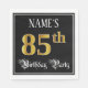 This opulent and ornate birthday themed paper napkin design features a custom name and the message “85th Birthday Party”. The large number “85th” has a faux/imitation gold-inspired coloring pattern, the words “Birthday Party” are in elegant script-style text, and the background is colored black by default (although it can be customized). Fancy, luxurious paper napkins like this might be used at a birthday party being held in celebration of somebody’s 85th birthday. [~Z0000565]